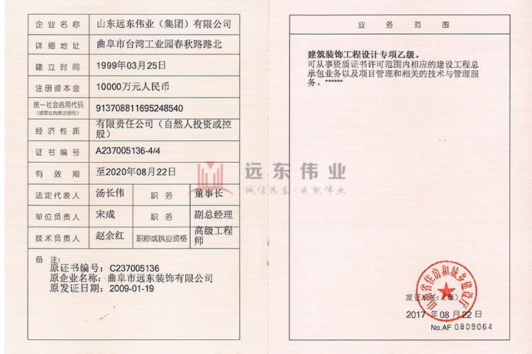 建筑裝飾工程設(shè)計(jì)專項(xiàng)乙級(jí) 2023-09-13 09:20:26 上一條:建筑門(mén)窗行業(yè)資格證書(shū) 下一條: 塑料窗節(jié)能認(rèn)證證書(shū) 相關(guān)資訊 夯實(shí)基礎(chǔ)·砥礪奮進(jìn) | 重慶龍... 正在施工的和新承接的項(xiàng)目情... 近年完成的類似項(xiàng)目情況表... 關(guān)于加強(qiáng)項(xiàng)目部農(nóng)民工工資支... 熱門(mén)推薦 黃海明珠中心 濟(jì)寧運(yùn)河城 開(kāi)發(fā)區(qū)萬(wàn)達(dá)廣場(chǎng) 中國(guó)重汽濟(jì)寧商用車(chē)有限公司