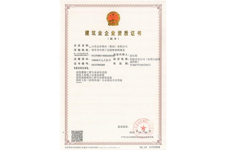 建筑幕墻工程專(zhuān)業(yè)承包壹級(jí) 建筑工程施工總承包貳級(jí) 建筑裝修裝飾工程專(zhuān)業(yè)承包貳級(jí) 2023-09-13 09:24:52 上一條:建筑幕墻資質(zhì) 下一條: 重合同守信用企業(yè) 相關(guān)資訊 夯實(shí)基礎(chǔ)·砥礪奮進(jìn) | 重慶龍... 正在施工的和新承接的項(xiàng)目情... 近年完成的類(lèi)似項(xiàng)目情況表... 關(guān)于加強(qiáng)項(xiàng)目部農(nóng)民工工資支... 熱門(mén)推薦 黃海明珠中心 濟(jì)寧運(yùn)河城 開(kāi)發(fā)區(qū)萬(wàn)達(dá)廣場(chǎng) 中國(guó)重汽濟(jì)寧商用車(chē)有限公司