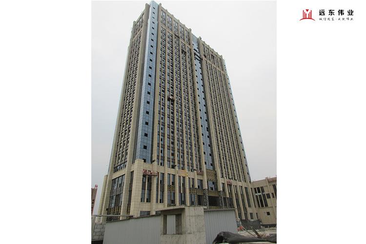 綠業(yè)元集團(tuán)豫東農(nóng)資物流園區(qū)綜合樓位于河南省周口市扶溝縣文化西路以北,金海路以西。該項(xiàng)目建筑包括主樓、裙房,建筑高度99.95米,標(biāo)準(zhǔn)層高4.0米,地下1層,地上23層,裙樓地面以上3層。本工程外裝飾主要涉及豎明橫隱玻...